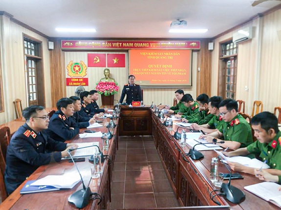 Thực hiện Kế hoạch công tác kiểm sát năm 2026, ngày 18/3/2026, Đoàn kiểm sát của Viện kiểm sát nhân dân (VKSND) tỉnh Quảng Trị do đồng chí Trần Quốc Vinh, Phó Viện trưởng làm Trưởng đoàn cùng các Kiểm sát viên thuộc Phòng 2 VKSND tỉnh và các Kiểm sát viên thuộc VKSND vực 1 - tỉnh Quảng Trị đã tiến hành trực tiếp kiểm sát việc tiếp nhận, giải quyết nguồn tin về tội phạm tại Công an xã Hoàn Lão. Đồng chí Trần Quốc Vinh, Phó Viện trưởng VKSND tỉnh phát biểu tại buổi làm việc.