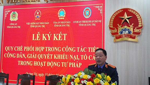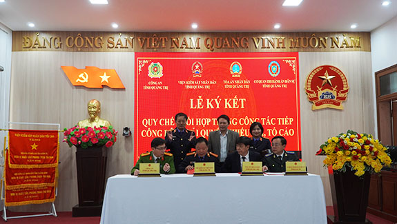 Chiều ngày 15/01/2025, Liên ngành tư pháp tỉnh Quảng Trị đã tổ chức Lễ ký kết Quy chế phối hợp trong công tác tiếp công dân và giải quyết khiếu nại, tố cáo trong hoạt động tư pháp. Tham dự buổi lễ có đồng chí Phan Thanh Dũng - Phó Trưởng Ban Nội chính Tỉnh ủy Quảng Trị; đại diện lãnh đạo các cơ quan tư pháp gồm Công an, Viện kiểm sát, Tòa án và Thi hành án dân sự tỉnh Quảng Trị.