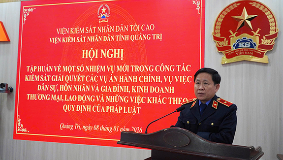 Đồng chí Hồ Thanh Hải, Bí thư Đảng ủy, Viện trưởng VKSND tỉnh phát biểu chỉ đạo Hội nghị Thực hiện chương trình công tác năm 2026 của Ngành Kiểm sát nhân dân, nhằm kịp thời triển khai, quán triệt các quy định pháp luật mới và yêu cầu nhiệm vụ mới của Viện kiểm sát trong công tác kiểm sát giải quyết các vụ án hành chính, vụ việc dân sự, hôn nhân và gia đình, kinh doanh thương mại, lao động và những việc khác theo quy định của pháp luật (vụ án hành chính, vụ việc dân sự) ngày 08/01/2026, Viện kiểm sát nhân dân (VKSND) tỉnh Quảng Trị tổ chức Hội nghị tập huấn về một số nhiệm vụ mới trong công tác kiểm sát việc giải quyết các vụ án hành chính, vụ việc dân sự.