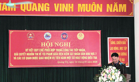 Ngày 14/01/2026, Viện kiểm sát nhân dân khu vực 7 - Quảng Trị tổ chức Hội nghị ký kết Quy chế phối hợp với các cơ quan được giao tiến hành một số hoạt động điều tra gồm: Các Đồn Biên phòng Cửa khẩu Quốc tế Lao Bảo, Cửa khẩu Quốc tế La Lay, Thuận, Thanh, Ba Tầng, Hướng Phùng, Hướng Lập, A Vao, Ba Nang; Hải quan Cửa khẩu Quốc tế Lao Bảo, Cửa khẩu Quốc tế La Lay; các Hạt Kiểm lâm Hướng Hóa, Đakrông, Khu bảo tồn thiên nhiên Bắc Hướng Hóa, Đakrông trong công tác tiếp nhận, giải quyết nguồn tin về tội phạm.