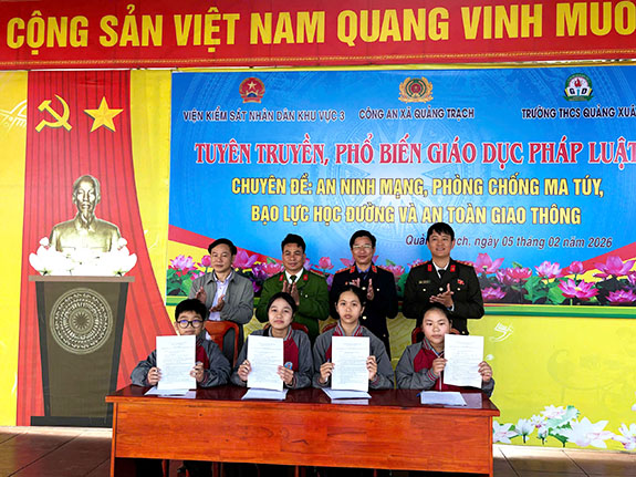 Kết thúc buổi tuyên truyền, đại diện Trường THCS Quảng Xuân và học sinh toàn trường đã ký cam kết không vi phạm pháp luật, chấp hành nghiêm các quy định về an toàn giao thông, phòng chống ma túy, bạo lực học đường; đồng thời ghi nhớ số điện thoại đường dây nóng của Công an xã, kịp thời phản ánh, tố giác các hành vi vi phạm pháp luật đến Nhà trường, phụ huynh, lực lượng Công an và các Cơ quan chức năng trong đó có Viện kiểm sát nhân dân khu vực 3.